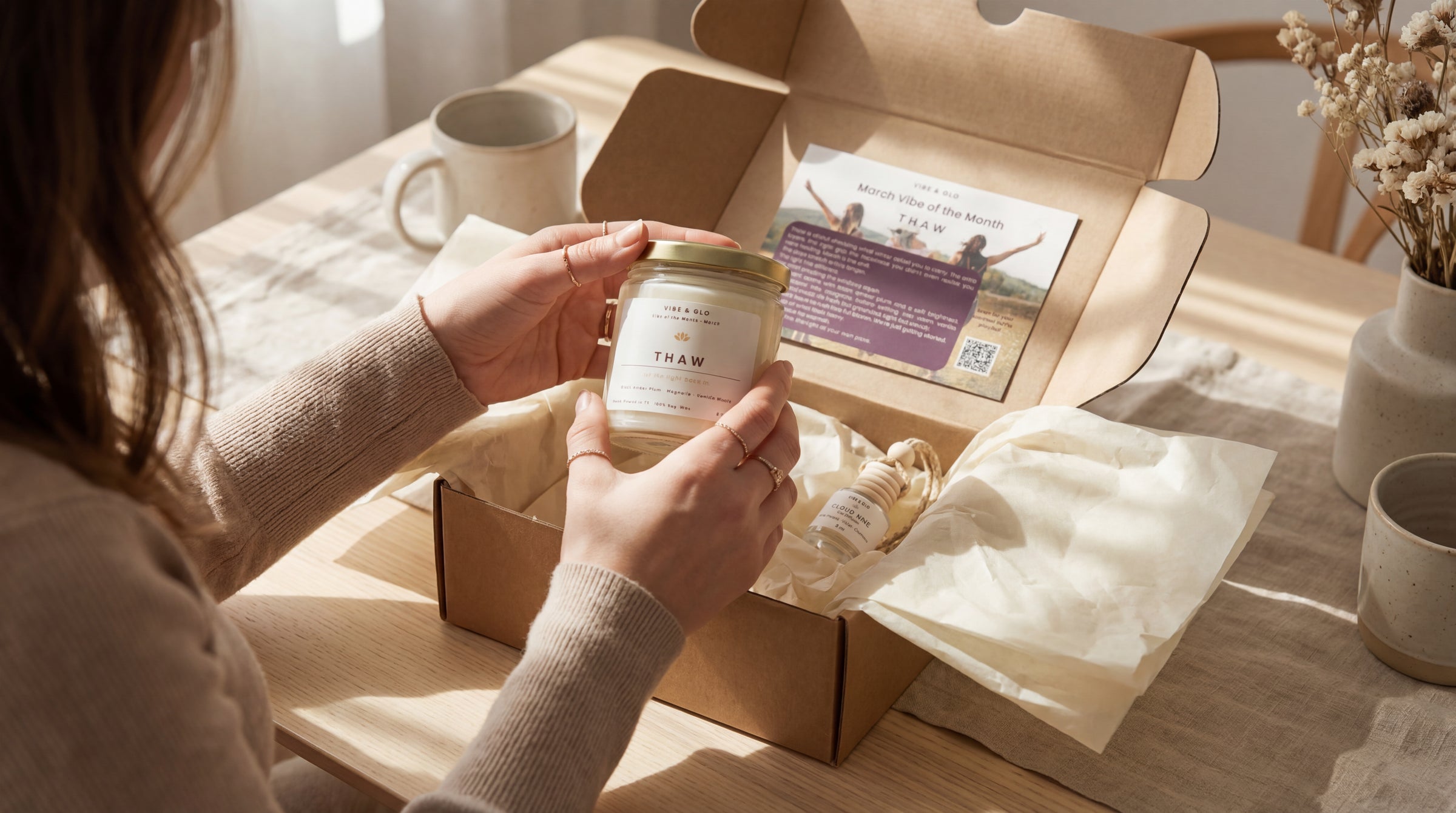 Each Vibe & Glo soy candle comes with a Mood Card featuring a QR code that links to a curated Spotify playlist designed to match the vibe of the scent.
