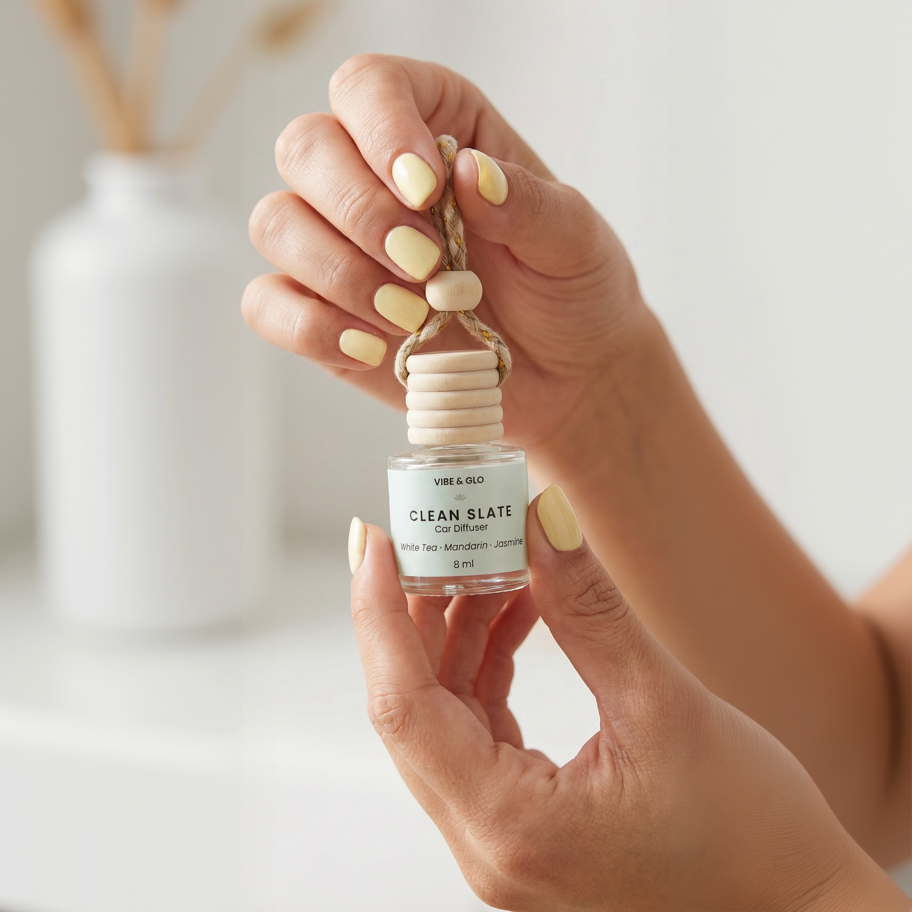 Hand holding a 'Clean Slate' car diffuser against a neutral background