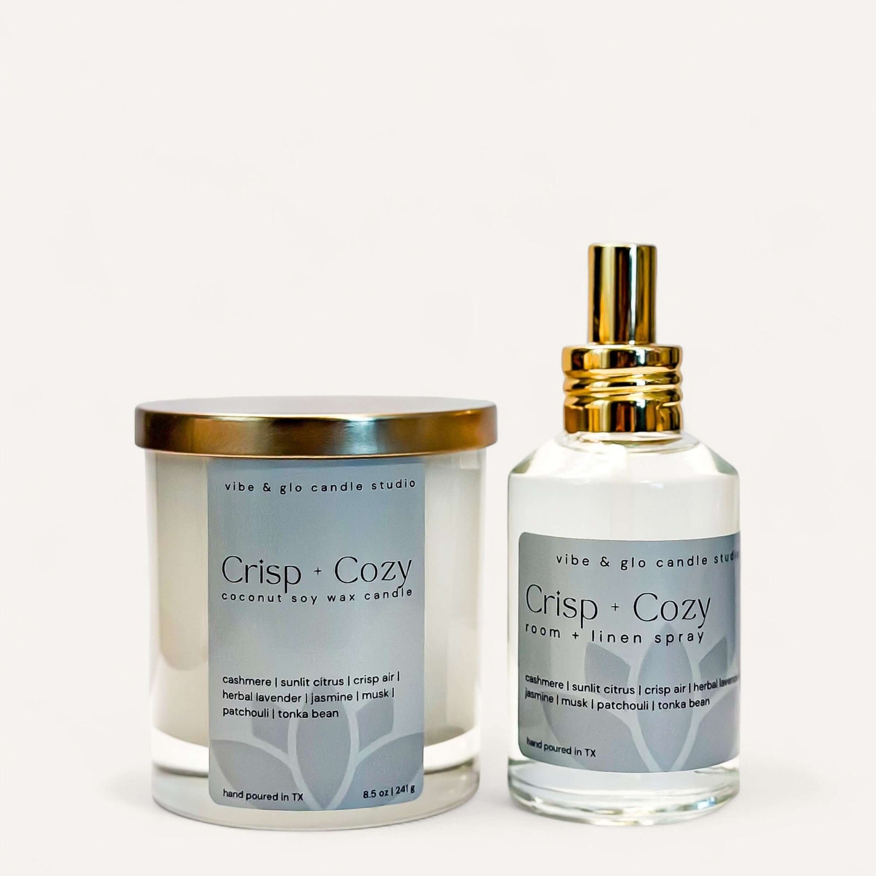 Turn your home into a fall retreat with the Crisp + Cozy Bundle. This set pairs our coconut soy wood wick candle with a matching room + linen spray to bring soft cashmere, sunlit citrus, and crisp autumn air into every space. Notes of herbal lavender, jasmine, musk, patchouli, and tonka bean create the ultimate fresh-meets-cozy balance.
