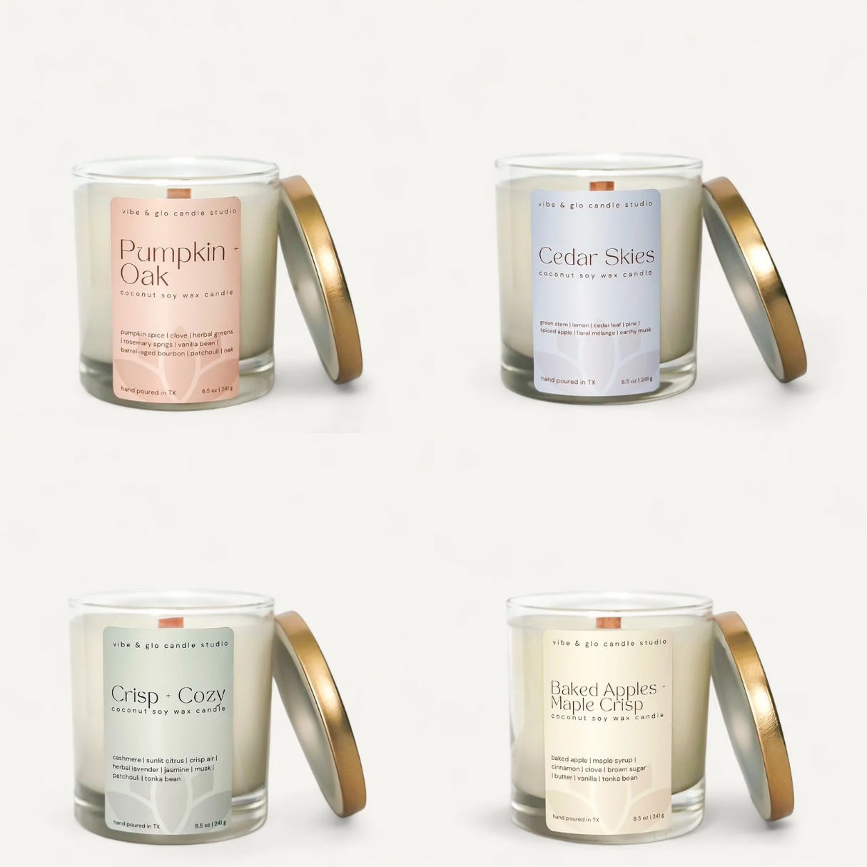- Includes 4 candles (one of each fall scent listed above)